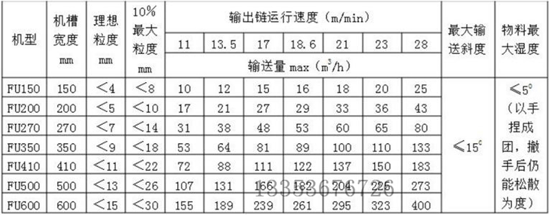 與其它類型的輸送機相比,F(xiàn)U鏈式刮板輸送機具有體積小、輸送能力大的優(yōu)點,它只需皮帶輸送機1/5的空間或螺旋輸送機2/3的空間就能輸送相同流量的物料。輸送能力達6m3/h~500m3/h。