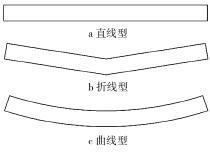 影響垂直螺旋輸送機性能的操作變量有螺旋轉 速、進口速度、填充系數、螺旋葉片的形狀、顆粒的形狀等。試驗選取進口速度為 10 m/s,由文獻[5]可知,填充系數對平均顆粒速度、平均顆粒軸向速度、平均顆粒周向速度的影響很小,而本文中主要分析近軸處的 平均顆粒周向速度、近壁處的平均顆粒軸向速度,因 此可選填充系數取做一個固定參數,即填充系數為 50%,忽略顆粒形狀對輸送性能的影響,因此試驗選 取了螺旋轉速、螺旋葉片作為操作參數,來展開詳細 的試驗設計。 根據文獻[5]的分析,選取螺旋轉速參數分別為600、900、1 000、1 200、1 400、1 600、1 800 r/min;螺旋 葉片母線的形狀分別為直線型、折線型、曲線型,其形 狀簡圖如圖 2 所示,由排列組合知識可知,需要進行21 次試驗。