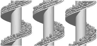 螺旋垂直提升機是螺旋輸送機中常見的一種。傳統的設計方法主要依靠經驗公式設計,導致很難對螺旋輸送機的性能有很大程度地提升,而其在制藥、港口、農業(yè)、水泥、食品等行業(yè)應用廣泛,因此有必要對螺旋輸送機的設計與制造方法進行研究。隨著計算機仿真技術的發(fā)展,越來越多的試驗應用于虛擬樣機的模擬中,這種處理不僅可以減少成本,提高效率,而且 能夠使設計者從產品的作用機理入手,解決在實際的 試驗中很難觀察物料輸送中細觀甚至微觀特征[1-2]。螺 旋輸送機性能的模擬研究,早是由 Shimizu 等[3]發(fā)表 離散元法對螺旋輸送機中顆粒流的研究,并將研究結 果與先前的經驗方程進行了對比分析。Cleary[4]研究了 顆粒形狀對喂料口進入的物料下降形式和輸送機的輸送特性的影響。Owen 等[5] 詳細研究了操作條件,如 填充率、傾角和螺旋轉速等對螺旋輸送機性能的影 響,但其未對螺旋葉片的形狀進行詳細討論。而這一課題在國內尚未有詳細的研究。本文中將對螺旋葉片進行研究,并結合其他操作條件,預測螺旋輸送機的性能。