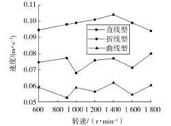 通過離散元模擬,得出了在不同轉速下的 3 種 不同螺旋葉片形狀對平均軸向速度變化趨勢,如圖 5 所示。 考察近軸處 12.75 mm 以內圓柱的平均軸向速 度,在螺旋轉速小于 1 600 r/min 時,隨著轉速的增加, 對于直線型、折線型的螺旋葉片,其平均軸向速度成 增大的趨勢,但曲線型的螺旋葉片,其平均軸向速度 沒有明顯的變化趨勢,且其軸向輸送速度遠小于直 線型、折線型母線的螺旋葉片對應的平均軸向速度; 但當螺旋轉速大于 1 600 r/min 后時,曲線型母線的 螺旋葉片對應的平均軸向速度超過了直線型、折線型母線的螺旋葉片的平均軸向速度,且直線型母線 的螺旋葉片的平均軸向速度有所減小,因此,在考慮 較大螺旋轉速下,曲線型母線的螺旋葉片具有的輸送效果,能夠減小一定輸送量中的輸送功耗,提 高輸送效率。